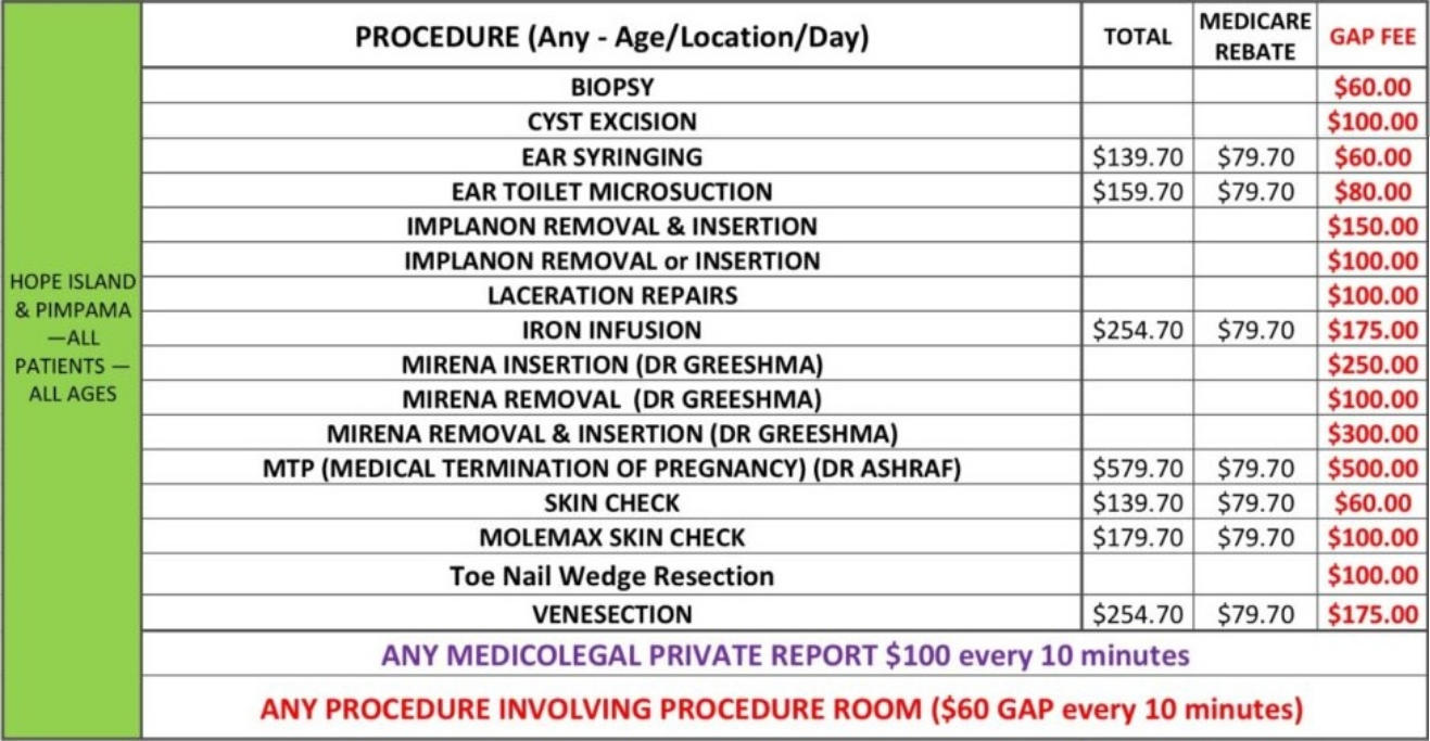 Procedures at both clinics will incur a Gap fee minimum of $60. Based on length of Procedure can be up to $360.